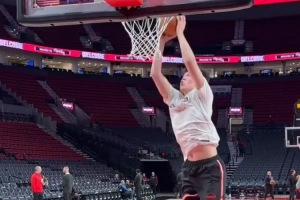 赛前,杨瀚森在助教陪同下进行热身,连续上演持球和空接暴扣,侧翼三分6中3。