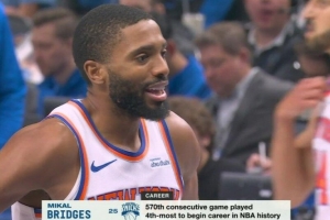 尼克斯球星米卡尔·布里奇斯职业生涯开始至今仍旧保持全勤,他已经连续出战570场,在NBA历史上排名第四。