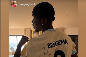 博格巴社媒晒照,他身穿本泽马签名球衣,并@本泽马,而后者也转发了这一动态。
