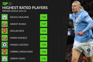 体育资讯11月19日讯 截至目前本赛季英超进行了11轮比赛,WhoScored列球员评分榜,哈兰德7.90居首,扎卡7.37第二。